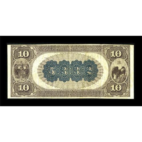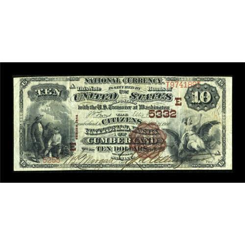 <B>Cumberland, MD</B></I> - $10 1882 Brown Back Fr. 490 <B>The Citizens NB</B></I> Ch. # (E)5332<BR> This is one of a mere three Brown Backs in the census for this bank. The signatures are bold while the brown ink is rich. The paper is bright and the solid edges enhance the appearance of this $10 greatly. <B>Very Fine+</B></I>.<BR><BR><b>Shipping:</b> Coins & Currency (<a target="_blank" href="http://www.heritageauctions.com/common/shipping.php">view shipping information</a>)