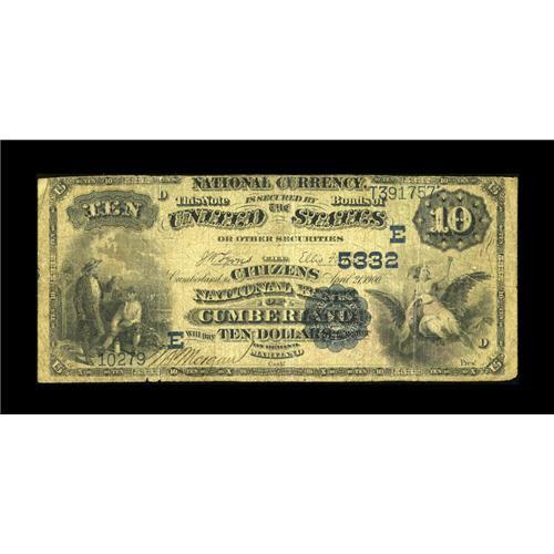 <B>Cumberland, MD</B></I> - $10 1882 Date Back Fr. 545 <B>The Citizens NB</B></I> Ch. # (E)5332<BR>A just plain rare bank which issued Second Charter notes only before liquidating at the expiration of its charter in 1920. The census shows just four specimens extant, one Brown Back and three Value Backs, with this the first Date Back of any denomination reported. <B>Very Good-Fine.</B></I><BR><BR><b>Shipping:</b> Coin/Currency (<a target="_blank" href="http://www.heritageauctions.com/common/shipping.php">view shipping information</a>)