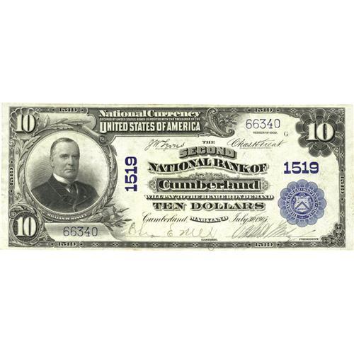 <B>Cumberland, MD</B></I> - $10 1902 Plain Back Fr. 625 <B>The Second NB</B></I> Ch. # 1519<BR>Pleasing pen signatures and crisp paper await the lucky bidder who wins this note. Census records indicate five large notes from here are uncirculated. This is the first time we have offered a note from here in one of our Signature sales. <B>Crisp Uncirculated.</B></I>