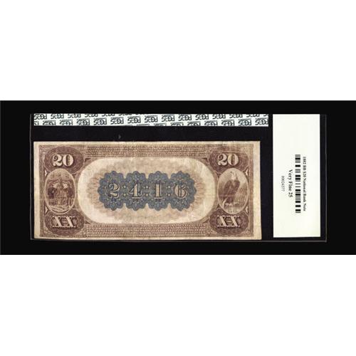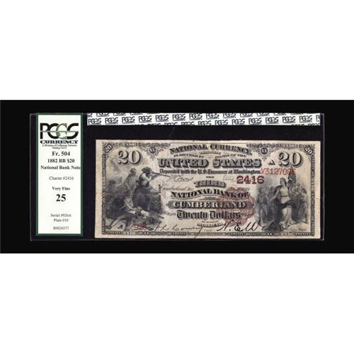 <B>Cumberland, MD</B></I> - $20 1882 Brown Back Fr. 504 <B>The Third NB</B></I> Ch. # 2416<BR>The population of Cumberland around the turn of the century (around the time this note was issued) was 65,000. Despite the relatively small populus, the town boasted three prolific issuers of National Bank Notes. This attractive example is fully detailed and problem-free. <B>PCGS Very Fine 25.</B></I>