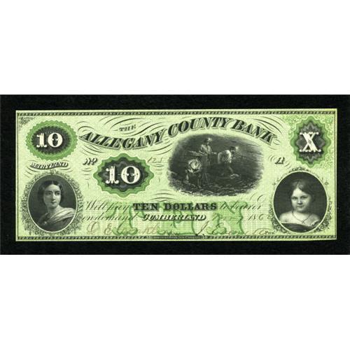 <B>Cumberland, MD- Allegany County Bank</B></I> $10 Nov. 7, 1862<BR> A detailed mining vignette and beautiful female portraits adorn this ABNCo Obsolete for this short-lived bank. <B>Choice Crisp Uncirculated.</B></I><BR><BR><b>Shipping:</b> Coins & Currency (<a target="_blank" href="http://www.heritageauctions.com/common/shipping.php">view shipping information</a>)