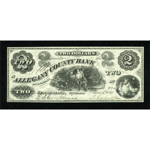 <B>Cumberland, MD- Allegany County Bank</B></I> $2 June 1, 1861<BR> This Deuce carries two classic vignettes in Obsoletes - <I>Boy and Horse at Stream </B></I>and the <I>Calmady Girls. </B></I><B>Choice Crisp Uncirculated.</B></I><BR><BR><b>Shipping:</b> Coins & Currency (<a target="_blank" href="http://www.heritageauctions.com/common/shipping.php">view shipping information</a>)