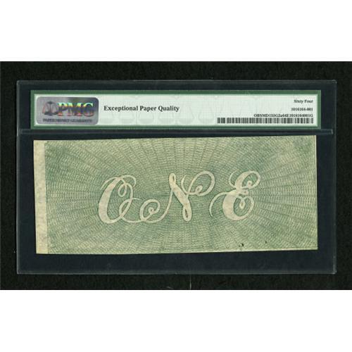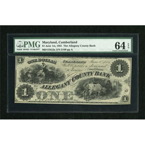 <B>Cumberland, MD- Alleghany County Bank</B></I> $1 June 1, 1861<BR> This bright issue is graded <B>PMG Choice Uncirculated 64 EPQ</B></I>.<BR><BR><b>Shipping:</b> Coins & Currency (<a target="_blank" href="http://www.heritageauctions.com/common/shipping.php">view shipping information</a>)
