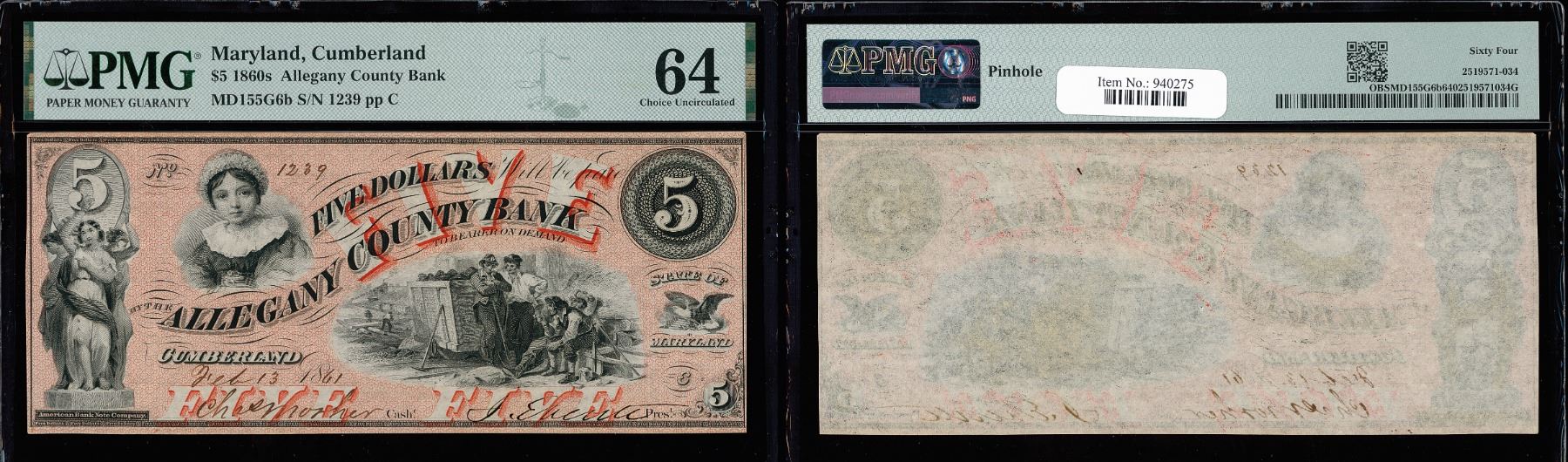 Cumberland, Maryland - Allegany County Bank $5 Feb. 13, 1861 G6b Shank 30.2.7 PMG Choice Uncirculate