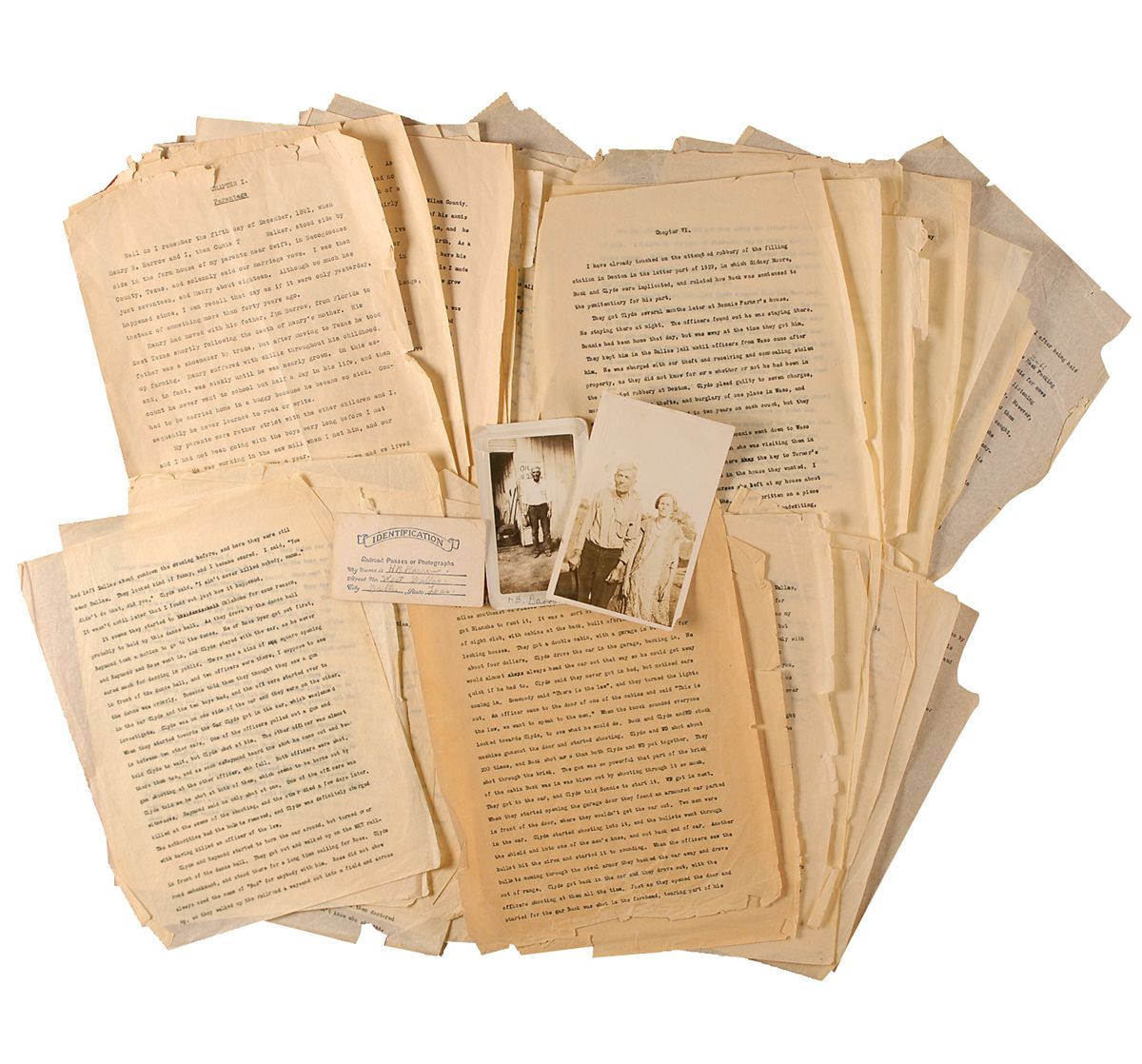 Very interesting archive from Clyde Barrow’s mother, Cumie Barrow (Walker). Centerpiece of the archive is a forty page unpublished manuscript, typed by Mrs. Barrow, detailing Clyde's boyhood, and focusing on the period from 1929 to his death in 1934. Chapters in the manuscript include titles such as “Buck’s Escape from the Penitentiary,” “Deeper Into the Mire,” “The Hillsboro Killing,” “The Atoka Killing,” “Killing of Deputy Sheriff Malcolm Davis,” “Clyde’s Attempt to Join Pretty Boy Floyd,” and “The End of the Trail.” Manuscript reads, in small part: “Mr. Barrow was the last one of the family to see Clyde alive. It was the evening of May 7th, just exactly two weeks and two days before he was ambushed and shot down by the officers near ---- La. Clyde would come by the filling station and toot his horn a certain way, and we got to know it was him. He did this instead of stopping in front of the garage so much and possibly attracting attention. Then he would stop and chat a few moments unless something looked suspicious, in which case he would drive on down the road and come back later, or maybe make several such trips by. Sometimes he would motion us to walk away from in front of the filling station….That night Mr. Barrow stayed with Clyde until nearly one o'clock in the morning, and finally Clyde told him to go on back to the filling station, as the officers would be watching his movements any way. The next time any of us saw him he was a corpse.