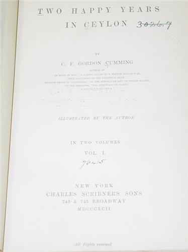 Cumming, C.F. Gordon. Two Happy Years in Ceylon - 2 Volumes. New York: Charles Scribner's Sons, 1892. 8vo - over 7¾" - 9¾" tall. Hard Cover. Ex-Library. Good ++ condition. Tissue guarded plates throughout, with the FOLD-OUT MAP in back. In library bindings, occasional pencil notation. SCARCE.