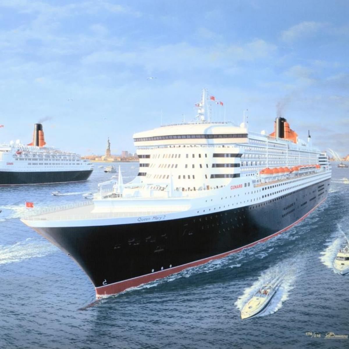 "Cunard Queens" is a limited edition on paper by Gordon Bauwens, numbered and hand signed by the artist. Measures approx. 44.5" x 36" (with border), 35.5" x 26.5" (image).