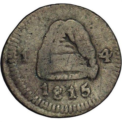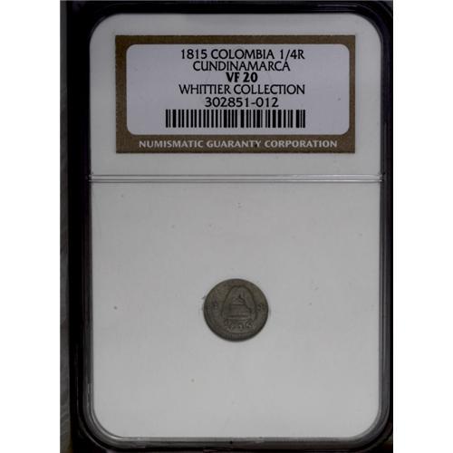 <B>Cundinamarca 1/4 Real 1815, </B></I>KM-F2, VF20 NGC, evenly worn with just a few small surface marks. An elusive type and date. Cundinamarca is a province in central Colombia which includes Bogota, and was one of the first areas in Colombia to declare its independence from Spain in 1813. Spanish forces regained control from 1816-1819, but after the battle of Boyaca, the province was again free.