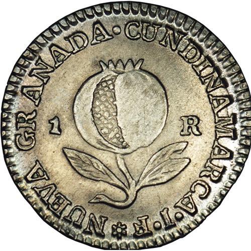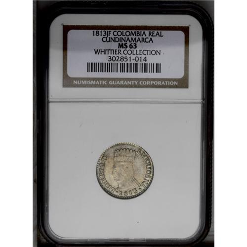 <B>Cundinamarca Real 1813-JF, </B></I>KM-F1, MS63 NGC, an incredibly bold, lightly toned example with immediate eye appeal. Considering the normally anticipated condition for this type, this coin represents one of the most remarkable grades in the entire collection. The details in the legends, Indian and pomegranate are sharply defined and there are no planchet flaws. Possibly the finest known.
