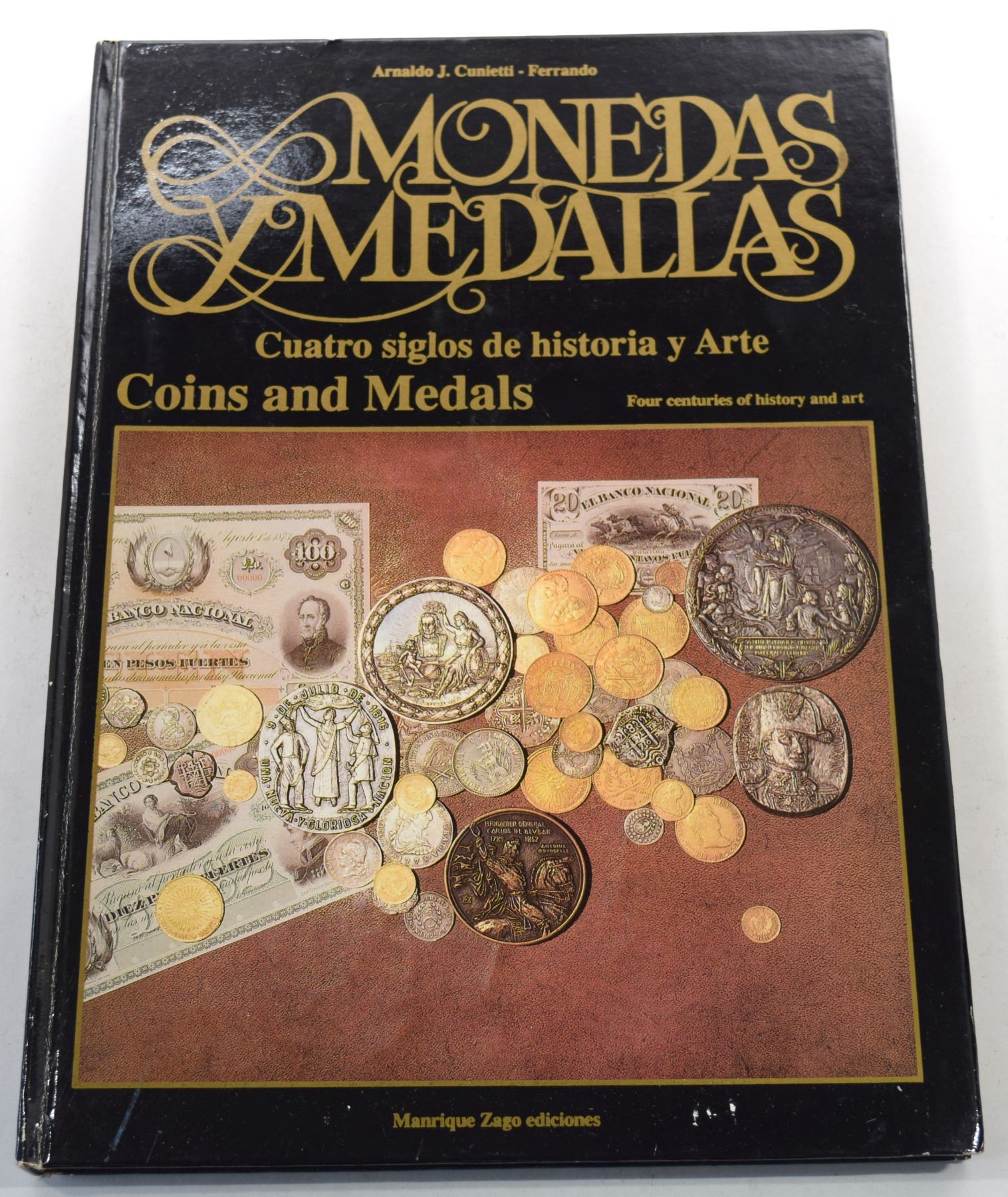 Cunietti-Ferrando, Arnaldo J. MONEDAS Y MEDALLAS: CUARTO SIGLOS DE HISTORIA Y ARTE. Manrique Zago Ediciones. 1989. fo, 159 pages; Hardcover; Pictorial boards; This book is a beautiful presentation of the coins, medals, and paper money of Latin and South America. Subject: Medals - Spain