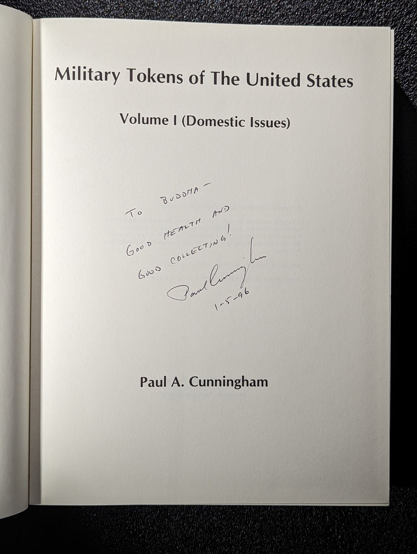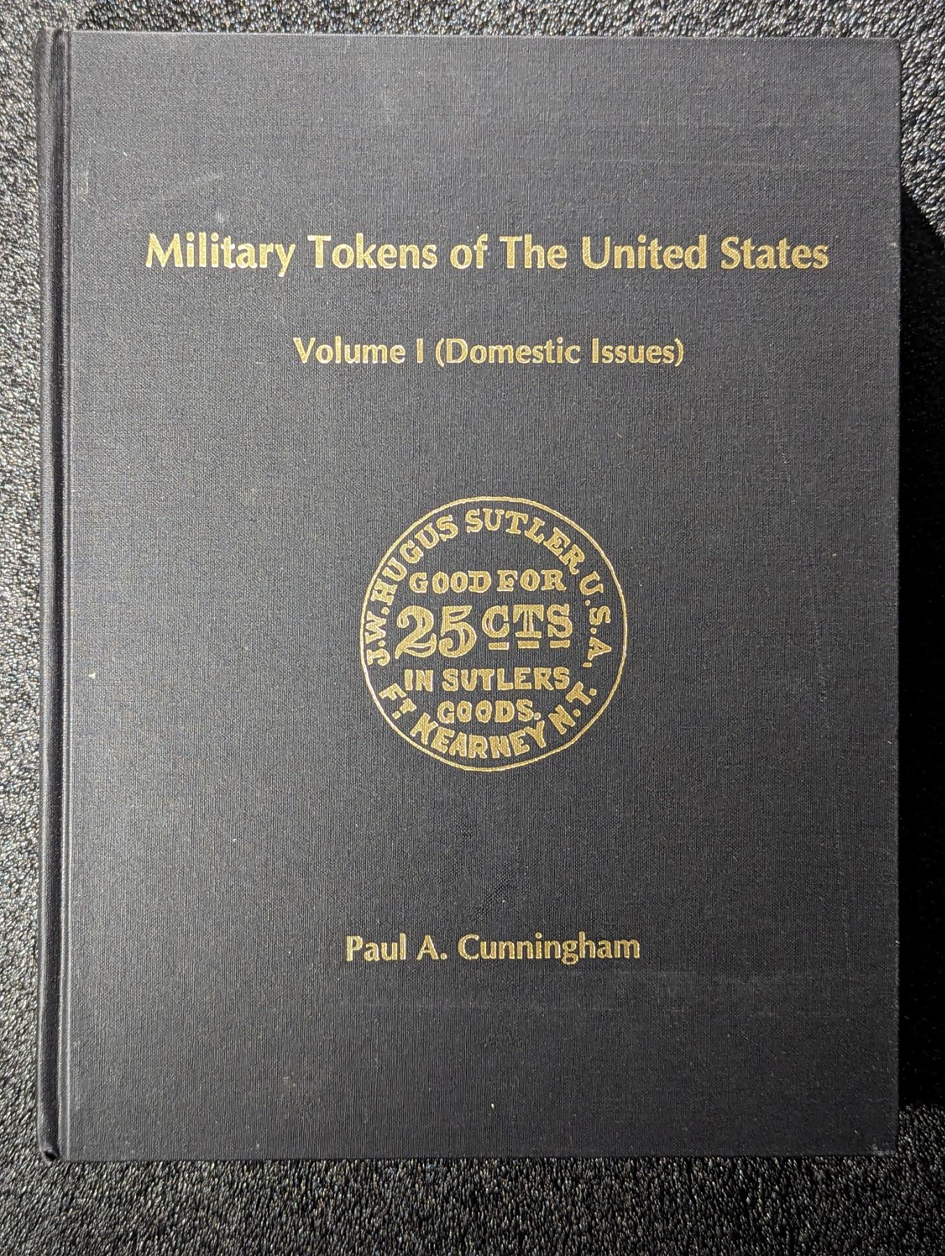 Cunningham, Paul A. MILITARY TOKENS OF THE UNITED STATES. VOLUME I (DOMESTIC ISSUES). Michigan Exonumia Publishers, Tecumseh. 1995. 4to. xiii, 440 pages. Original black cloth, gilt. Inscribed by the author. b&w historical and token photos and line illustrations throughout. Ex Libris of Melvin and George Fuld. Fine. This book is a guide to the military tokens issued by the military installations of the United States armed forces and this volume only includes domestically issued tokens. The tokens are organized by state and then alphabetically by installation and then by denomination. Each token is described and where possible a photo is presented. Lot weight: 3 lbs 11oz. Subject(s): United States Tokens.