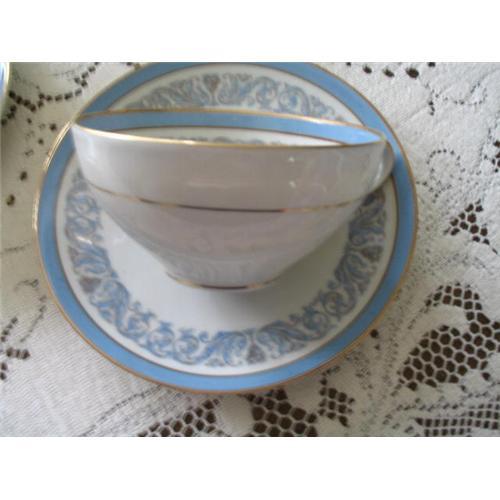 <table width="100%" border="0" cellspacing="0" cellpadding="4"><tr><td><em> These are special because they are stamped and numbered...and pretty too!</em></td></tr><tr> <td width="100%"> 2 pretty cups and 2 saucers. Stylish gold rim highlights pale blueish green border with designs. Stamped and numbered, "France Charles Ahrenfeldt Limoges #24"