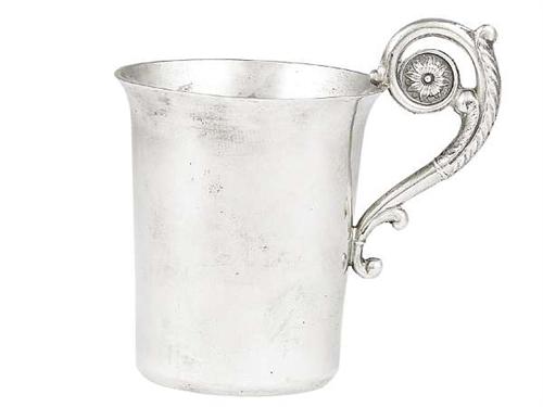 Silver, 102 g, gilt interior. Scroll handle. Marked: 12 lat fineness, Warsaw, between 1820 and 1830, Emil Radke. Size: 9 cm