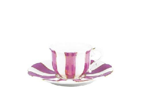 Porcelain painted with pink stripes and rimmed with gold, shaped border and foliated handle. Pressed mark on the cup and saucer: Regétz, 1863. Diameter: 15.5 cm, Size: 5 cm