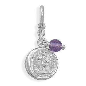 Sterling silver 13mm Cupid wax seal charm with faceted 4mm amethyst bead. Charm comes carded, with information about the wax seals and what they represent. .925 Sterling Silver