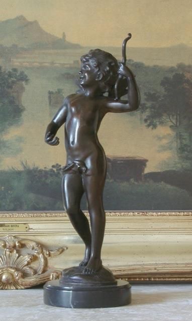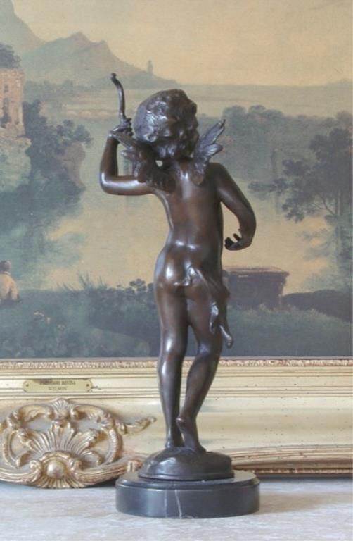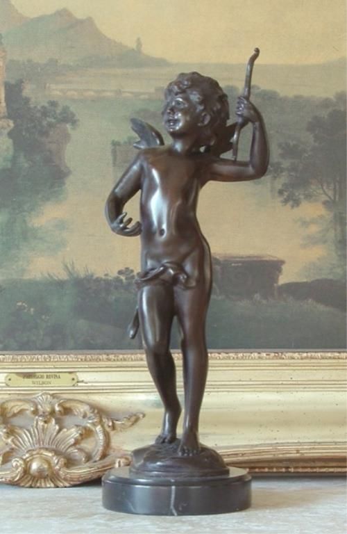 Cupid Cherub Bronze Sculpture, 16 H x 6 W x 5 D 10 lbs.This bronze sculpture was produced using the "Lost Wax" casting method. The"Lost Wax" Cast method is the most precise metal casting technique in existence, ensuring exquisite detail of the original host model which is usually sculpted in clay or wax. This "Lost Wax" casting method is an extremely labor intensive and expensive process, but the end results produce a Heirloom Quality Masterpiece!