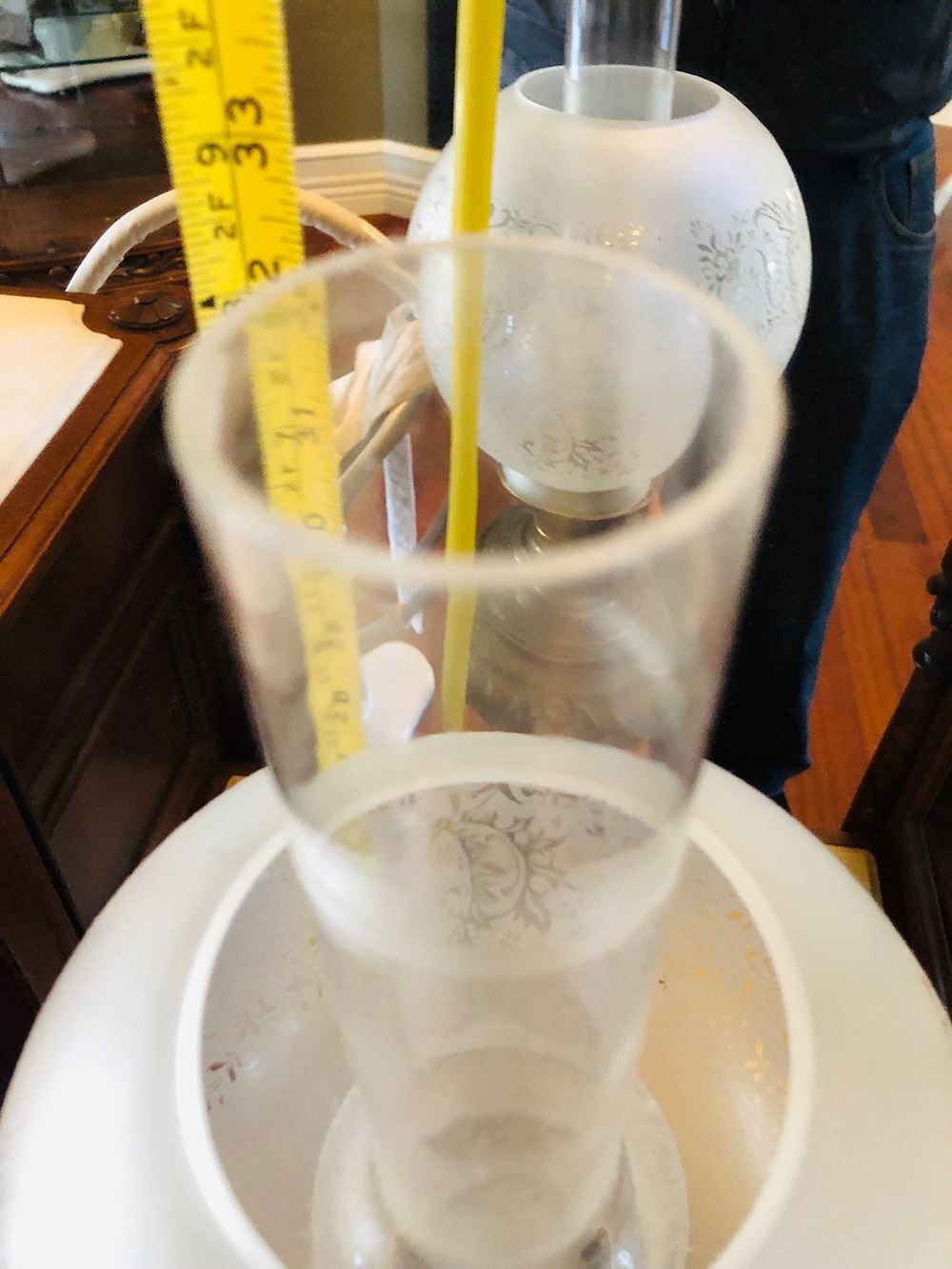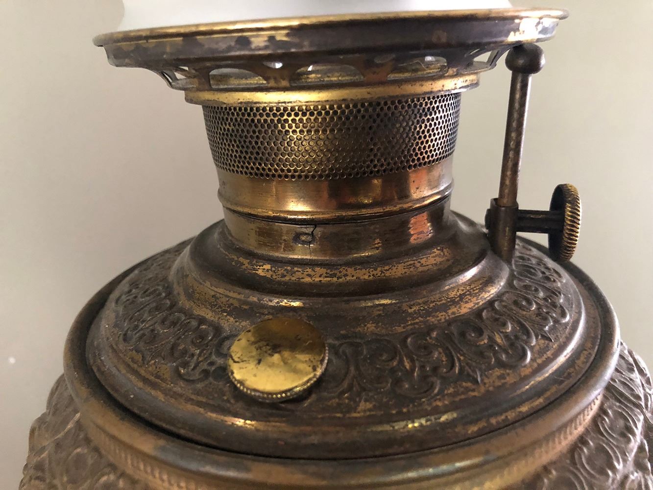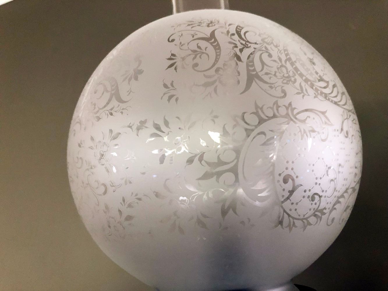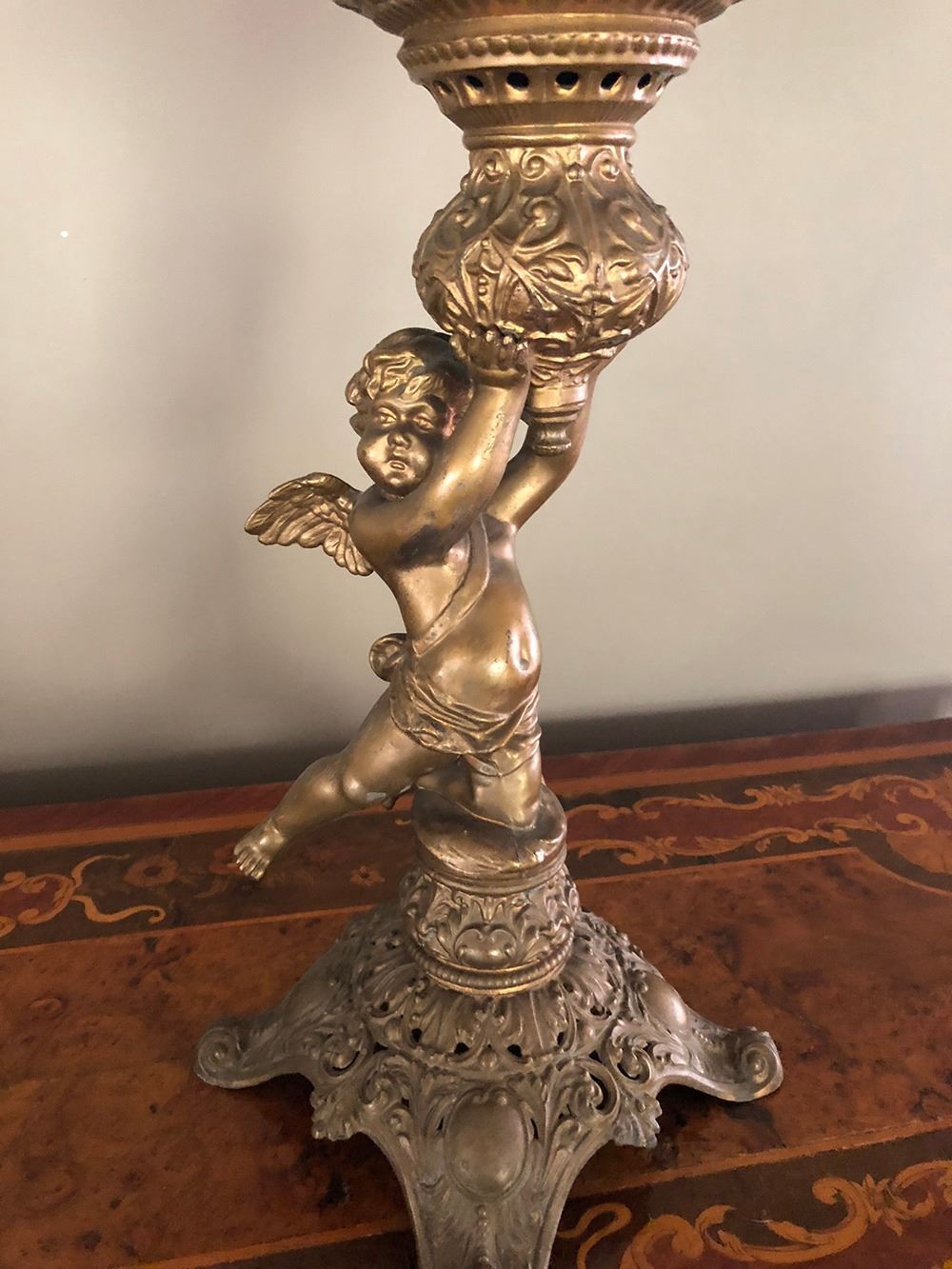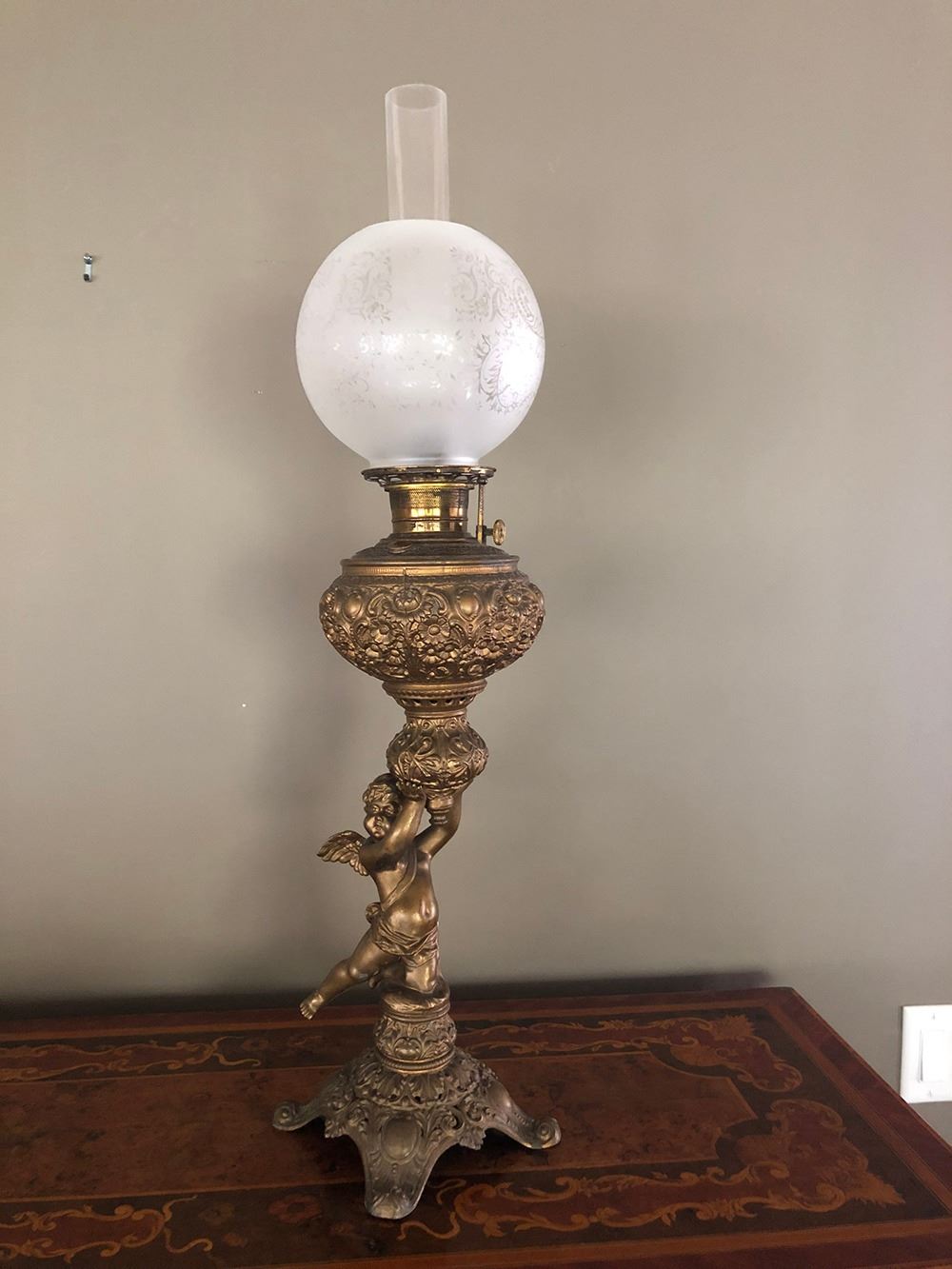 Cupid banquet lamp, has acid etched globe, all in original oil. American Wringer Co. New York maker. Measures approx. 32" tall.