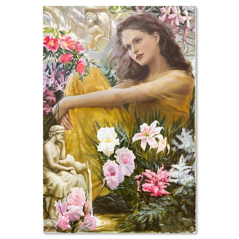 "Cupid's Arrow" is an original oil painting on stretched canvas by Slava Morgun, hand signed by the artist. Includes Letter of Authenticity. Measures approx. 47" x 32" (image). There is some wear on the corners and edges.