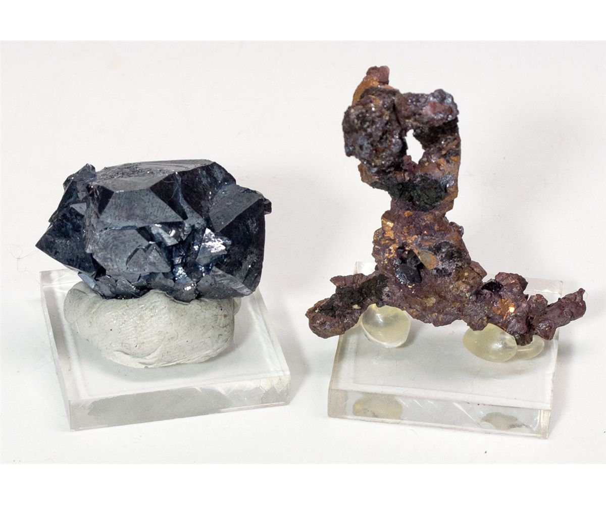 Lot of 2: In the year 2011 the worlds finest discovery of cuprite octahedrons, in association with native copper and native silver, was made at the Rubtsovsky Mine in Russia. For a very special and short time, fine cuprite octahedrons up to and exceeding an inch were recovered, some very special pieces showed native silver associations. The piece offered today is one of those displaying a cluster of undamaged cuprite octahedrons up to an inch with a three quarter inch patch of native silver under the main cuprite crystal, making for a unique display for the piece. This piece measures 1 x 1.33 x .75. 2.) Native Copper in association with crystal and cuprite. This is a very artisitc and asthethic specimen shows wire forms to the copper with an unsual loop form at the top. Crowned in small cuprite cystals. Measures 2 x 1.5 x .5 - HKA#65141