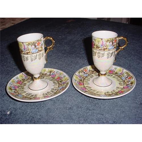 Two sets for sale demitasse cups and saucers with very beautiful details - romantic figures, florals, gold, and a beautiful glazing of a variety of colors. Must see up close to really appreciate these beautiful colors.