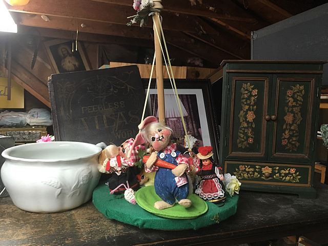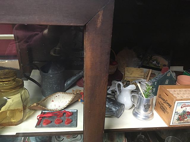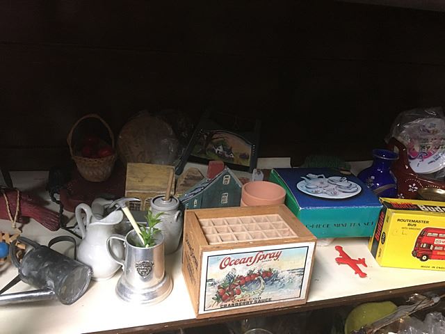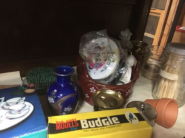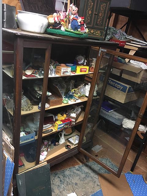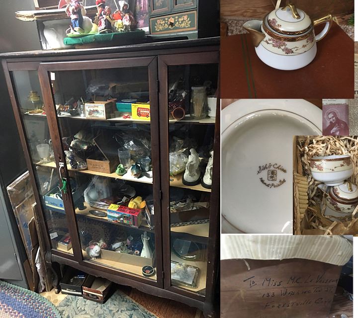 Estate Curio cabinet, 1 door, 4 shelves, all glass front with contents including, May Pole with dolls, jewerly box, vintage atlas, bisquit jar, dolls china tea set, die Cast Budgie, vases, figurines, salt cellars, salt and peppers, misc. china, San Francisco Cable Car toy, vintage Ladies Home Journal, etc. Also included is a set of China that was shipped from over seas by Father White, many, many years ago that the family kept in it's original shipping box and a scrapbook of Father White, who was a local priest in the Forestville/Bristol CT area.