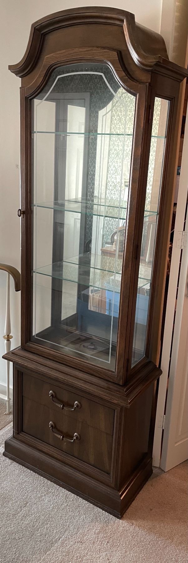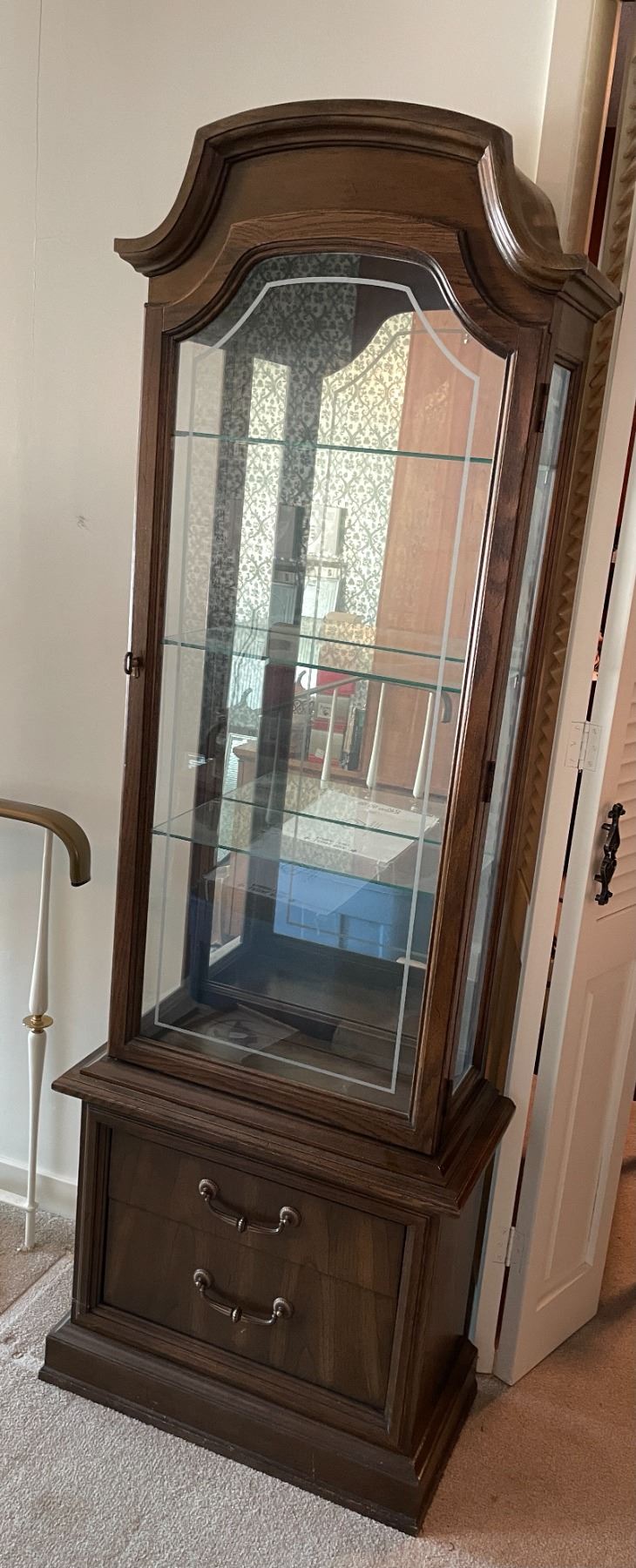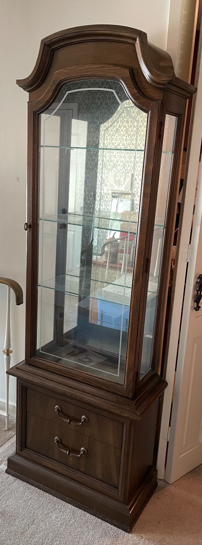 Curio Cabinet with light. Dimensions 69" height x 19.5" wide x 9 3/4" deep