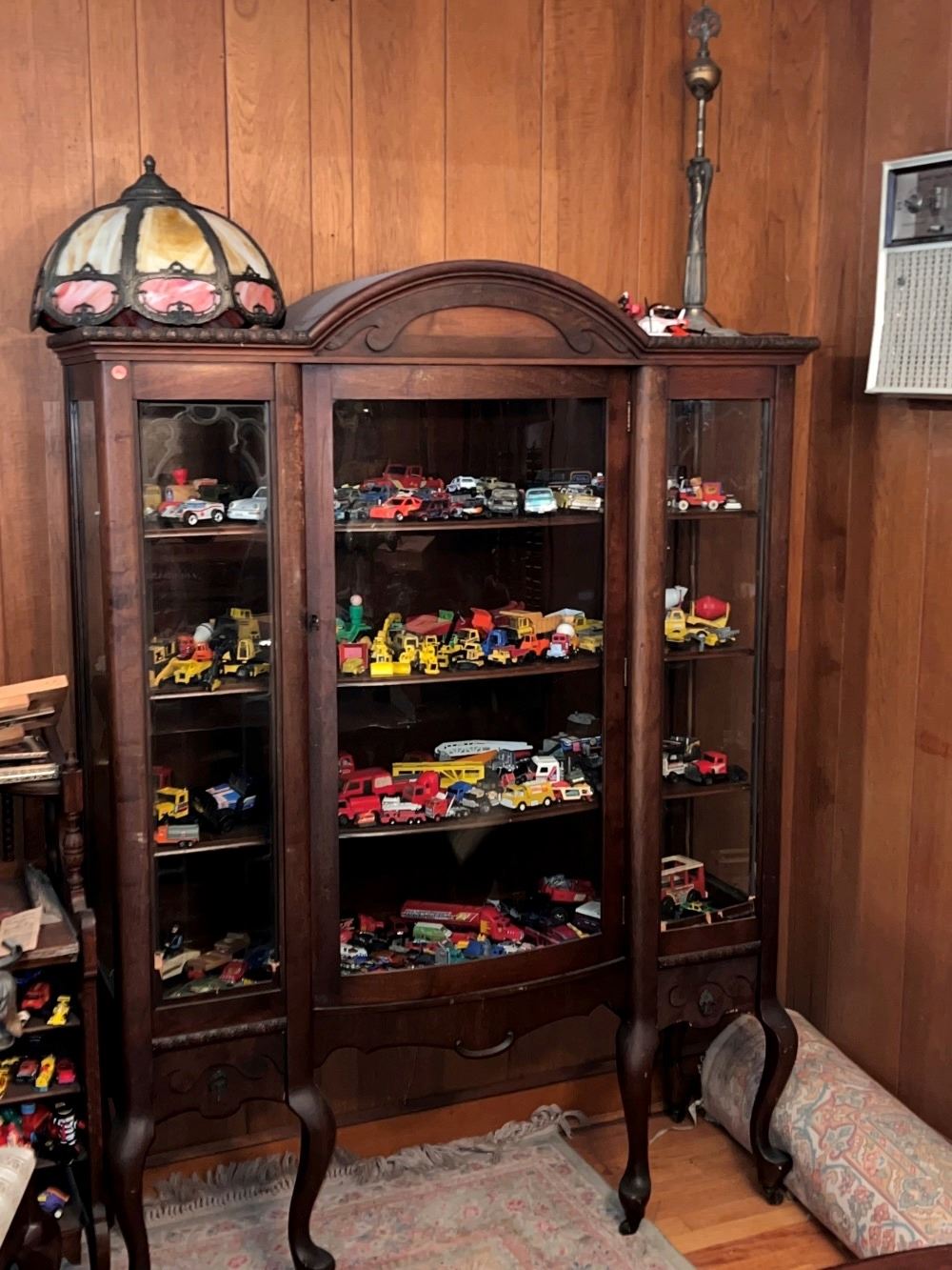 Curio cabinet, 1 door, crest, 4 shelves, measures approx. 68 inches tall x 50 inches wide x 15 inches deep.