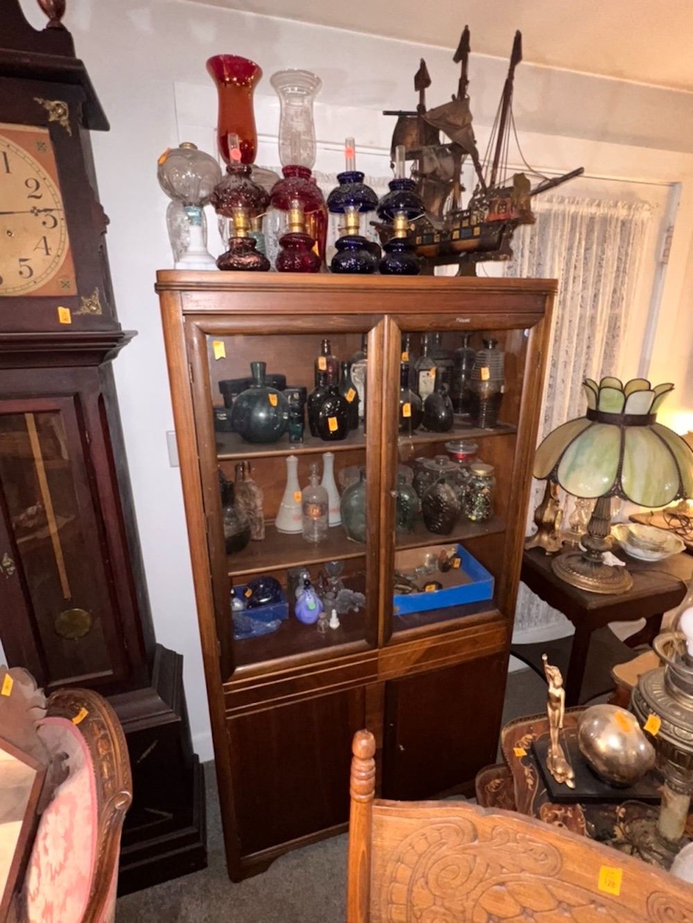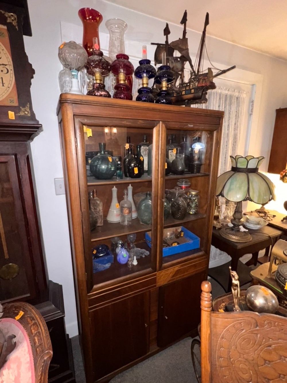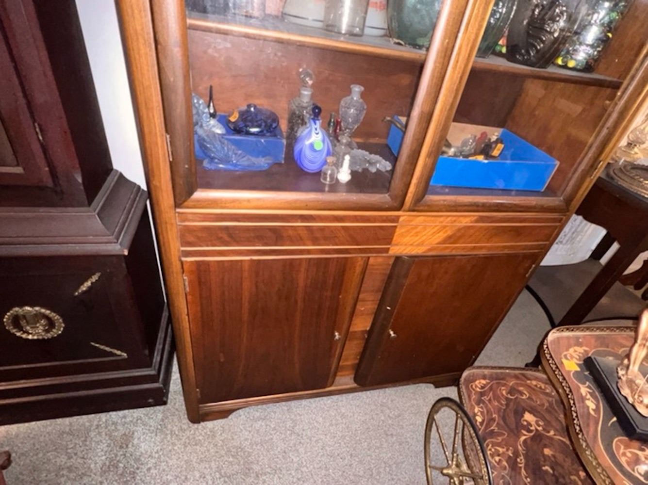 Curio cabinet, 2 glass doors, 3 shelves, 2 bottom doors.