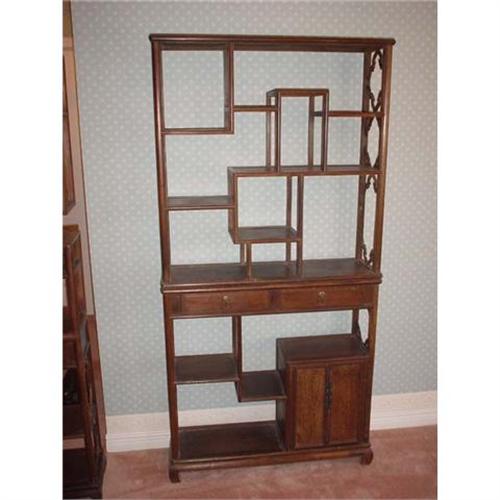 What a fun piece! Originally Qing dynasty curio shelves, presents two pieces separately with two drawers, one storage and bulging legs ending in horse-hoof feet. The good proportions and the tasteful decoration endow the shelves with a lightness and a beauty that are quite outstanding.