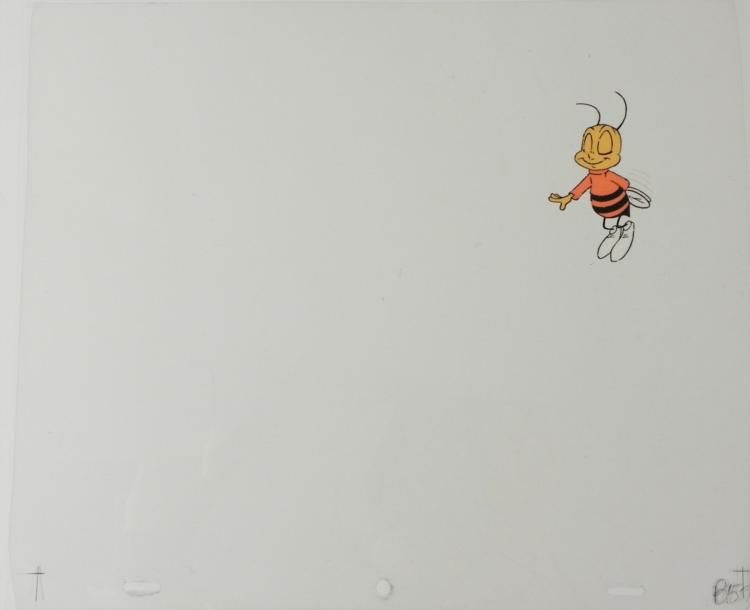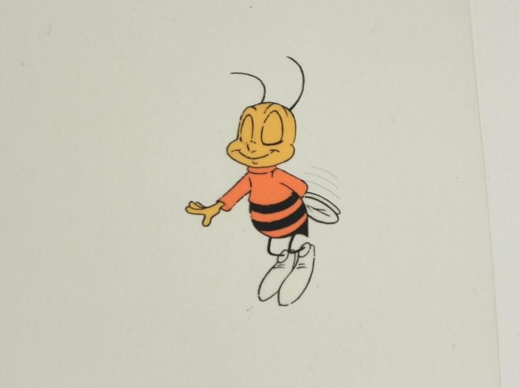 Buzz is a curious bee * * * Original Animation Cel * Medium: Hand painted acetate celDetails: Animation notations and peg holes * * Size of cel: 10 1/2 x 12 1/2 inchesCondition: Very good * This is an original hand-painted cel set-up used in the production of * the "Cheerios commercial." Each one-of-a-kind set-up represents a slight * change in position of the characters. When individually photographed * and projected in rapid succession, the images * appear to move. To created production cels, the original animator's * drawing is transferred onto an acetate cel (by hand-inking and/or photo * copying). The cel is then hand-painted on the reverse side. *