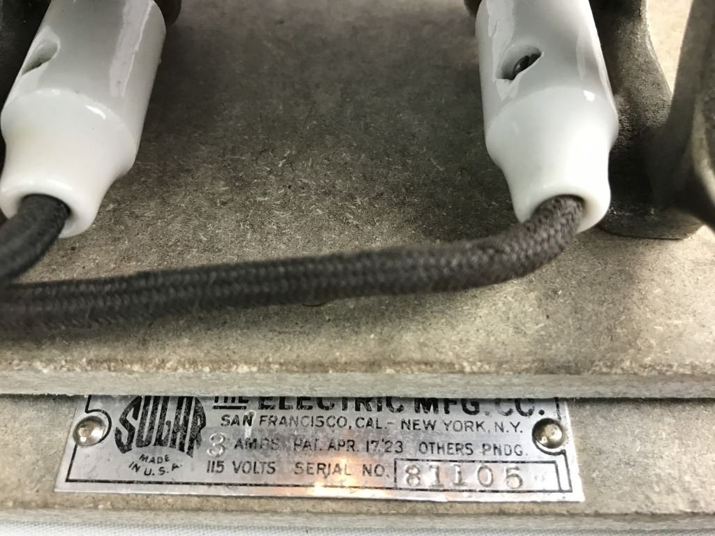 Sulhr the electric Mfg co. American patent April 17, 23 others pending. Note: tested but didnt leave on long. Did start to heat up.