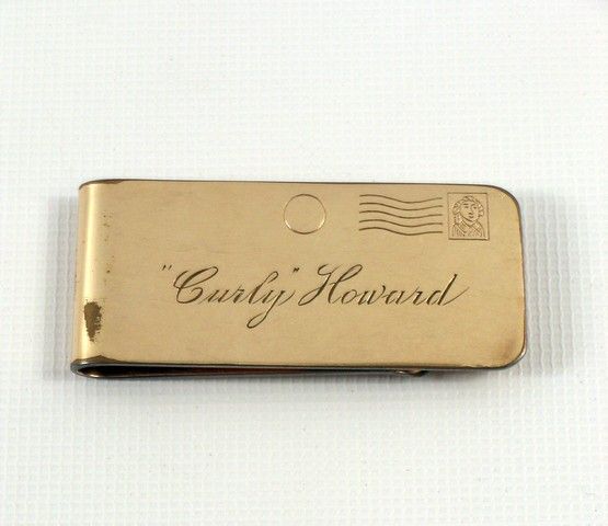 Curly Joe Howard Personal Gold Money Clip Jerome Lester "Jerry" Horwitz was born in 1902. We all know him better as Curly Howard, without a doubt the most beloved of the Three Stooges. If anything. he alone personified the Stooges forever with his iconic "Nyuk-Nyuk-Nyuk", his barking like a dog, his high pitched voice (especially his trademark: "sortinely"!), and his sideways spin. His brothers Moe and Shemp also became a part of the threesome at various times, as well as the non-brother, Larry Fine. Curly was known for his almost insane generosity. In private life, he was well known for pulling out his famous "almost solid gold" personalized money clip, and peeling off bills to those in need, or to give generous tips. This money clip became part of his legend, and friends and fans were known to shout: "Hey Curly, did you remember your clip?!" This is that one-of-a-kind rare piece of beloved Curly Joe Howard Memorabilia. First in the collection of his brother Shemp Howard's wife, Babe Howard, and then in the hands of one of the top Three Stooges collectors, this clip comes with a myriad of documentation, including a hand-written letter from Babe Howard, a Letter of Provenience from Dan Lange, the mega-Stooge expert and collector and last owner of the clip, and letter from Jill Howard, granddaughter of Babe Howard authenticating her grandmother's letter. The gold clip has "CURLY HOWARD" engraved on it with the easily recognizable "postmark" engraved on the upper right hand corner. The clip also comes from an extremely rare original family album photograph of Curly with his gather, Solomon Horwitz who Curly adored, and always said gave him his "addiction to generosity". (Gold clip approx 2"x 1', photo 8"x10").