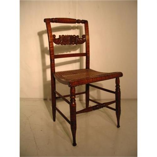 Curly maple side chair with carved back splat and cane seat. Classic example of a New York high country side chair dating to circa 1820. Measuring 34 1/2" high by 17 1/2" wide by 15 1/2" deep. Great accent to an high country setting.