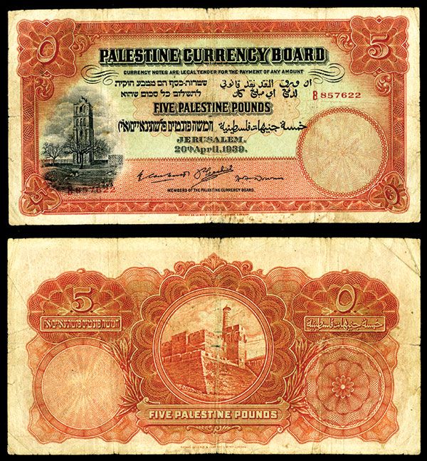 Palestine, issued note, 5 Pounds, 1939, P-8c, PMG 25 VF NET Splits, TDLR.
