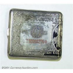 Currency Cigarette Case.<p>A half size case with a blue "TEN" and a red serial number. The hinge and clasp are perfect and the internal ribbon is present. This is a scarcer case. Important notice: We expect to be auctioning lots at the rate of 200-250 per hour. Sometimes eBay Premier live bid software cannot keep up with that pace, so we strongly recommend that you place a realistic proxy bid now as insurance to avoid disappointment. Also please note that all Heritage/CAA lots purchased through eBay Premier carry a 20% Buyer's Premium.