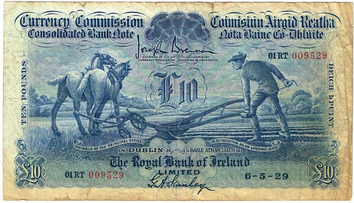 01RT009529. Signed Brennan and Stanley. Very good, slight staining, some pinholes, 3cm tear top centre. A rare note.
