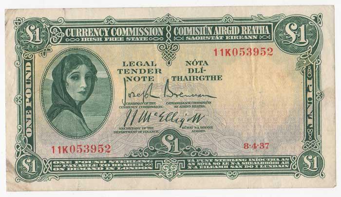 Currency Commission. Irish Free State. One Pound. 8-4-37