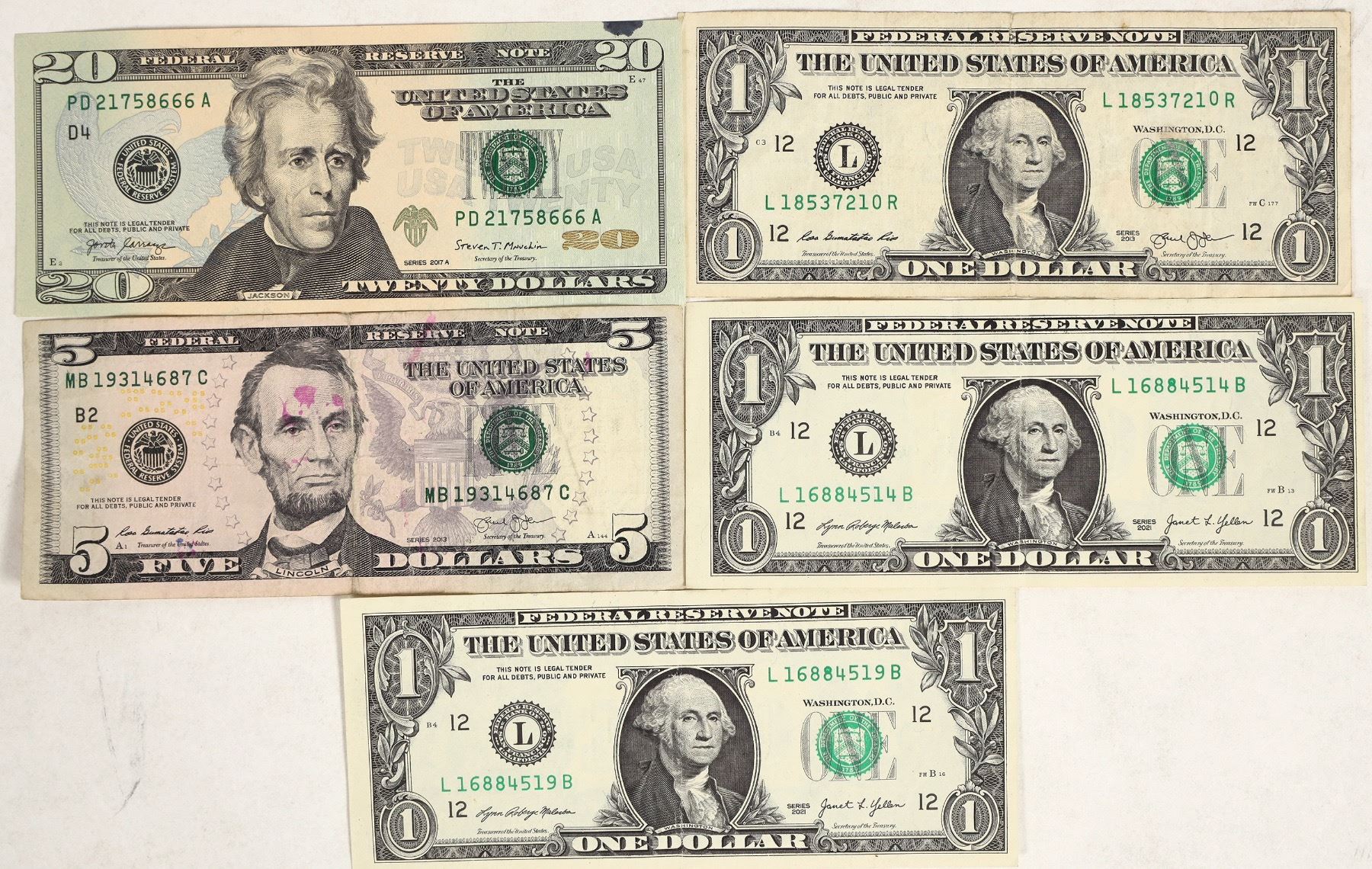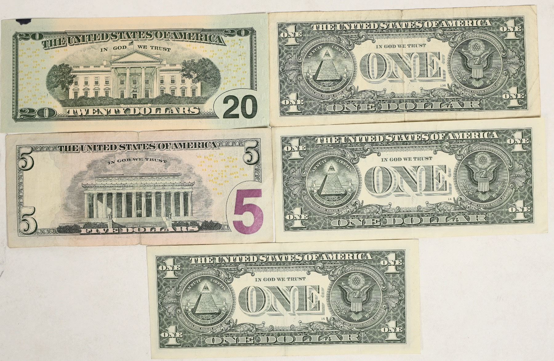 Five U.S. currency notes with something wrong: 1) misaligned serial number on a $1 Federal Reserve Note; 2 & 3) Filled in top half of the serial number "8" in two $1 Federal Reserve notes. 4) Ink spots on Lincoln's forehead on a $5 Federal Reserve note. 5) Ink splotch error upper right corner of a $20 Federal Reserve Note.