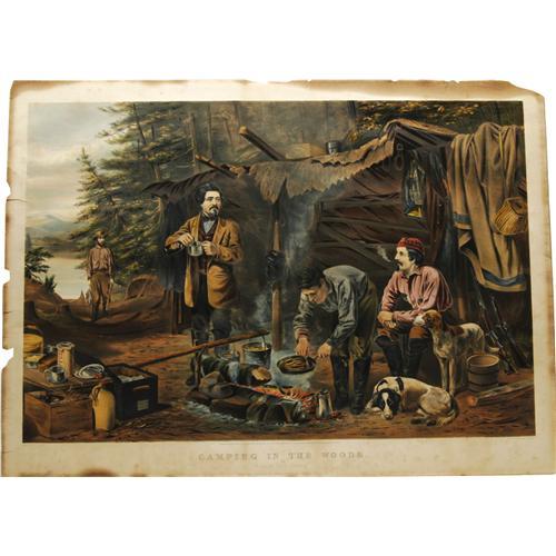 <B>Currier & Ives "A Good Time Coming" Lithograph.</B></I> From the <I>Camping In The Woods</B></I> Series this print is dated 1863. It was painted by A.F. Tait and then printed and published by Currier & Ives. In good condition with smoke stains around the edge. Small hole present on the lower edge; small tears on left and upper edges. Will display nicely, colors are still dark and saturated. A handsome image. Measures 30" x 21".