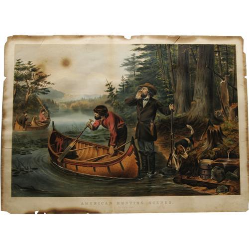 <B>Currier & Ives "An Early Start" Lithograph.</B></I> From the <I>American Hunting Scenes</B></I> Series this lithograph dates to 1863. It was painted by A.F. Tait and then printed by Currier & Ives. Measuring 30" x 21"; in good condition. Print has several smoke or burn marks around the edges; paper has begun to flake due to acid degradation; small tears on upper edge, lower edge, and left edge. This print will still display nicely despite the wear.