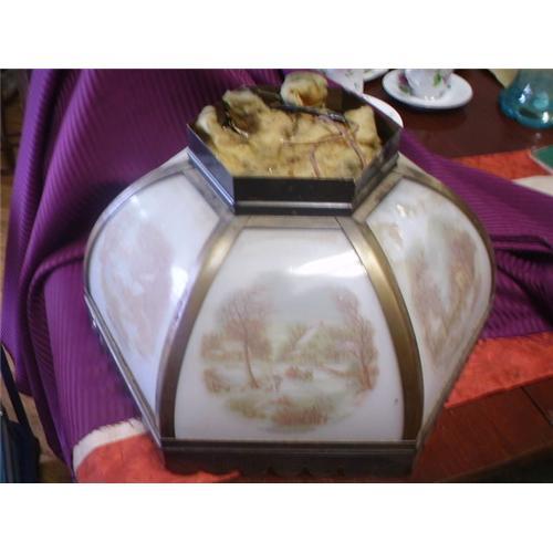 FOR YOUR CONSIDERATION IS A VINTAGE 1950's CURRIER & IVES GLASS CEILING FIXTURE DONE IN A VARIETY OF BEAUTIFUL SCENIC WINTER PICTURES AND EACH SIGNED "CURRIER & IVES" THE LAMP CONSISTS OF 6 PANELS AND PICTURES ENTITLED (2) EACH OF "A HOME IN THE WILDERNESS", (2) THE HOMESTEAD IN WINTER" AND (2) THE FARMER'S HOME" CREATED INTO A TRUE PIECE OF ART WORK. THE LAMP, WHICH HAS A GLASS BOTTOM COVER, IS IN GREAT WORKING ORDER, EXCELLENT CONDITION, NO CHIPS NOR CRACKS. THIS WONDERFUL LAMP MEASURES 14" TALL by 16 1/2" WIDE AT THE LARGEST POINTS. PLEASE ASK ANY QUESTIONS THAT YOU HAVE.