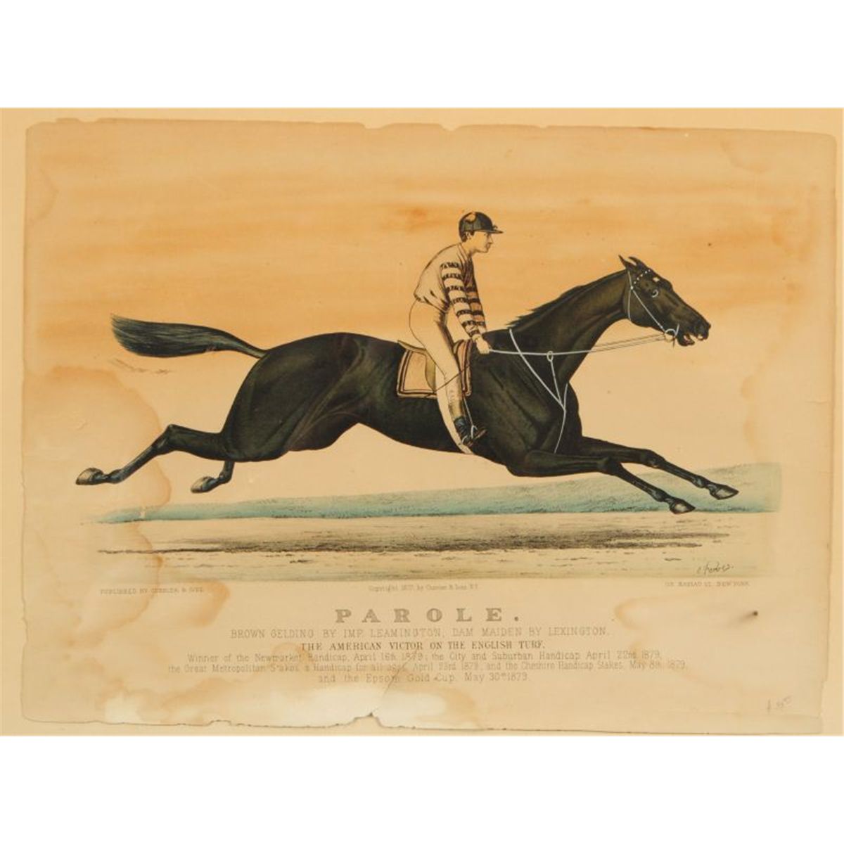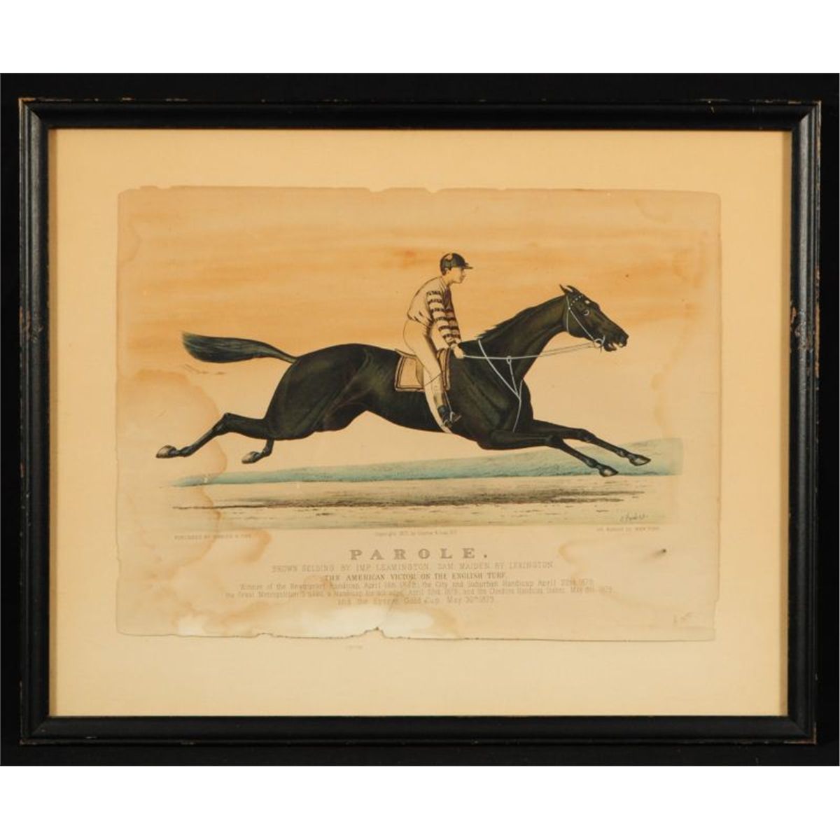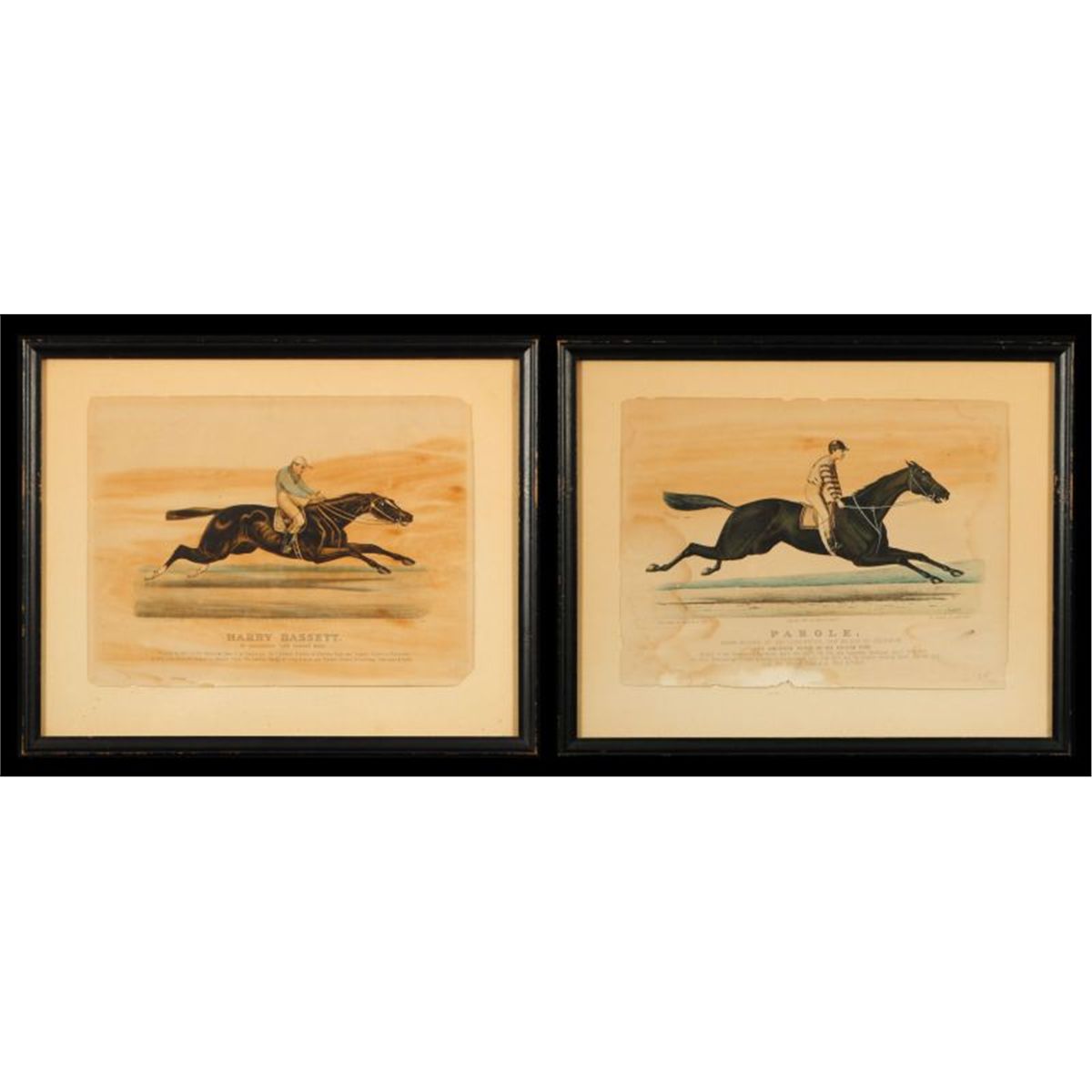 Two Early Currier & Ives Hand Colored Race Horse Prints. E. Forbes "Parole" 1879 (12” x 17”) and J. Cameron “Harry Bassett” 1871 (12” x 16”). Both show condition issues through out. One of the most famous match races of all time.