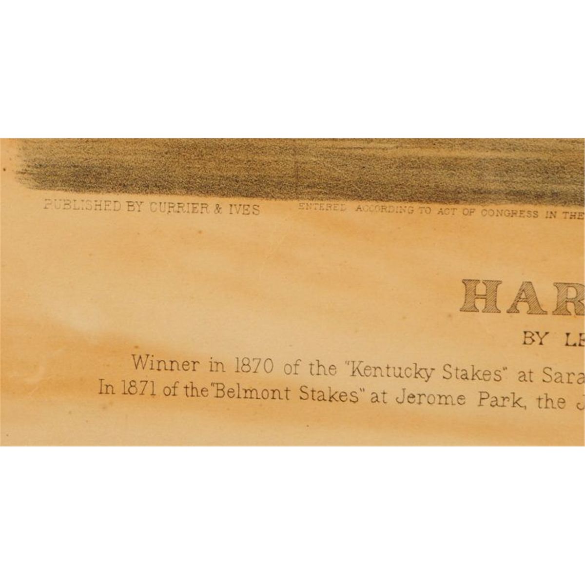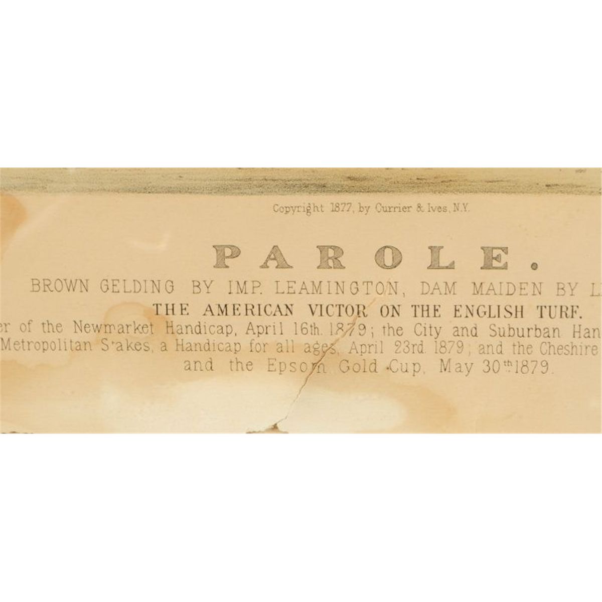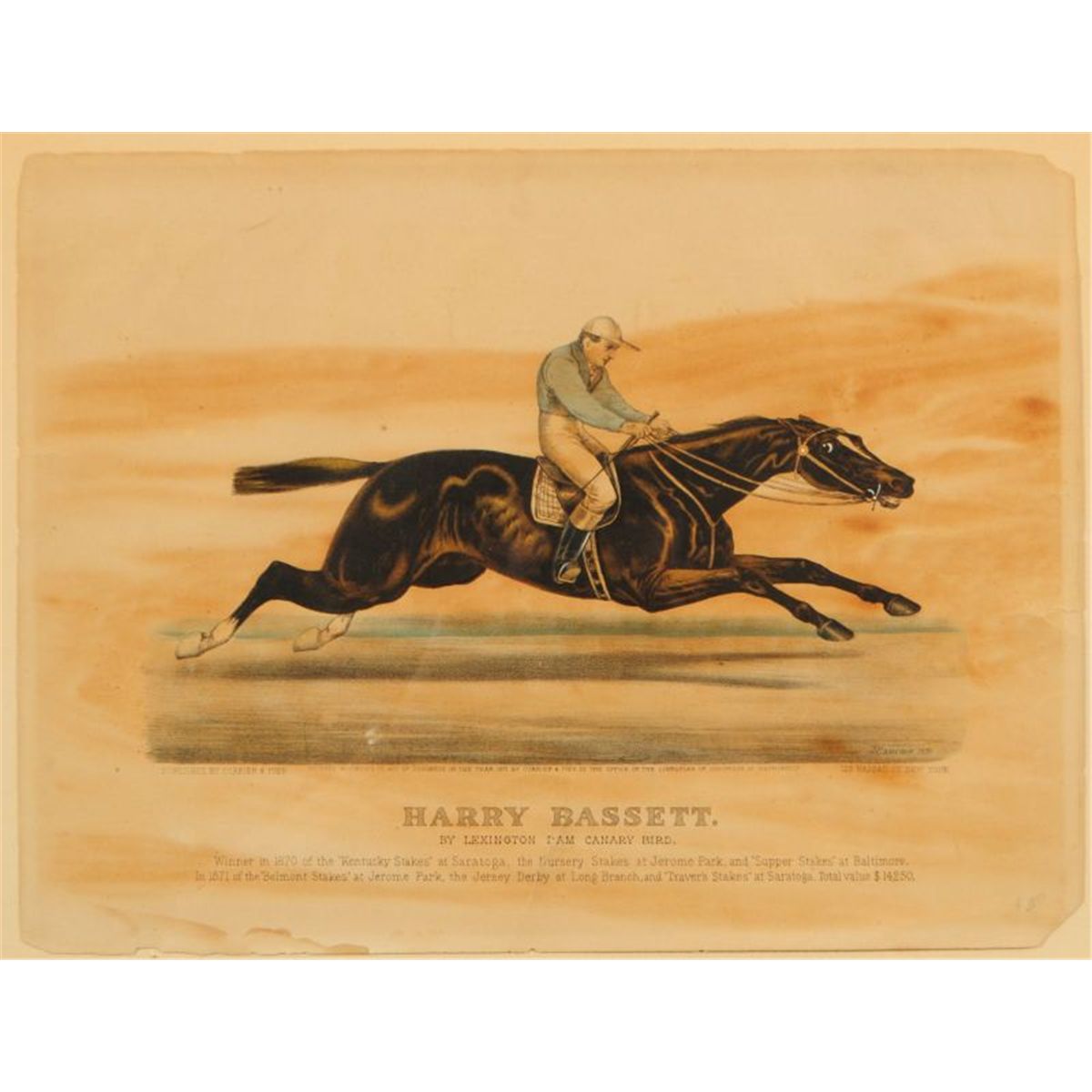 Two Early Currier & Ives Hand Colored Race Horse Prints. E. Forbes "Parole" 1879 (12” x 17”) and J. Cameron “Harry Bassett” 1871 (12” x 16”). Both show condition issues through out. One of the most famous match races of all time.