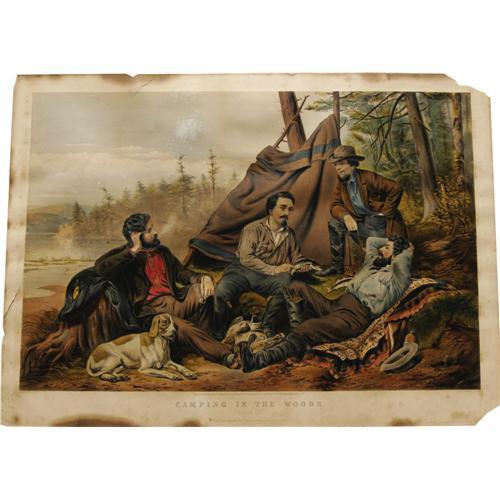 <B>Currier & Ives "Laying Off" Lithograph.</B></I> From the <I>Camping In The Woods</B></I> series and dated 1863 from inscriptions on the truncation. Measures 30" x 21" and depicts four men sitting by a lake with a dog after they have caught some trout and grouse. A very nostalgic and "folksy" scene. The print is in excellent condition with smoke damage present on the edges; the lower right corner and upper right corner are missing but this can be covered easily by a mat when framing. There is a stain from water damage in the upper left of the image.