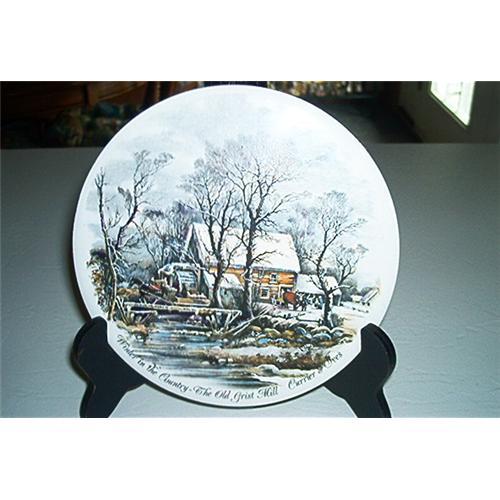 Featuring a beautiful Currier & Ives Tile. Back of tile states: Mid-State 2. Pictured on the front: "Winter In The Country - The Old Grist Mill - Currier And Ives". 6 inches in diameter. Excellent Condition.