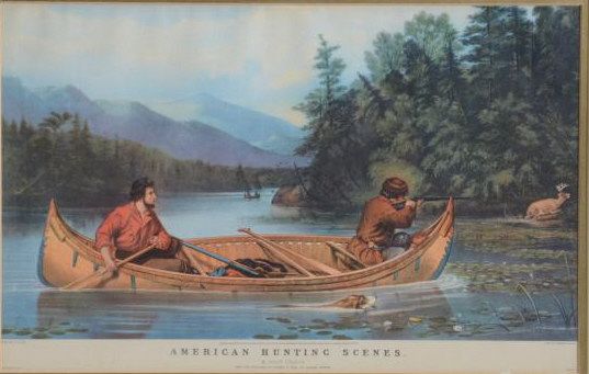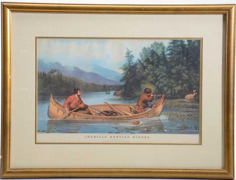 Currier & Ives print of American hunting scenes, entitled "A Good Chance", left corner shows Freeman Co., New York City, right corner litho in U.S.A., left edge shows painted by E. F. Tate. The artwork is10-1/4" x 16-1/2", nicely framed and matted. Condition is very good+, slight aging, circa 1900-1940. Est.: $150-$300