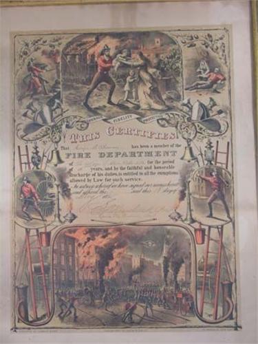 1877 Currier & Ives original fire department certificate presented in 1885 to village of Glens Falls, NY - stamped with city seal. 18" x 24" minor staining.