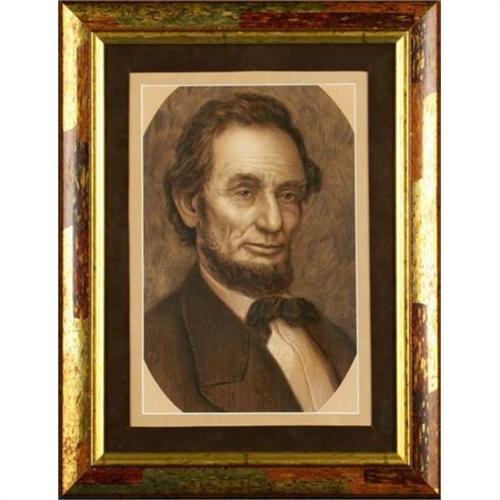 Exquisite lithograph portrait of Abraham Lincoln by the printing company of Currier and Ives. It is labeled Currier and Ives. It is a highly defined portrait with a wonderful likeness.There is a beautiful distressed gold and bronze finished wood frame used and two mats. A top mat of chocolate suede and a bottom mat of cream suede bring out the colors in the picture beautifully.From 1834 to 1907 the firm of Currier & Ives Provided for the American People a pictorial history of their country's growth from agricutlural society to an industrialized one . For nearly three quarters of a century the firm provided " colored Engraving for the people" and in the process became the visual raconteurs of nineteenth -century America
