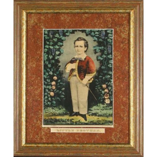 Original authentic lithograph print by the Currier & Ives company. This is a wonderful piece for any collector. It is in great condition and has the hand coloring the company was known for. It shows a young boy dressed in his sunday best surrounded by a wild rose bush. He has a delightful smile on his perfectly rendered face. This portrait of a young boy comes in a washed gold colored frame which fits the theme wonderfully. A garnet colored mat marbled with gold surrounds the image. Image size is 8 x 11. A title cut opening displays " Little Brother". The firm of Currier & Ives, the most famous lithographers in America, was founded by Nathaniel Currier at 1 Wall Street in 1834. In 1852 Currier engaged as a bookkeeper James Merrit Ives, who had recently married into the family. An artist in his own right and with business acumen and a critical eye for technical perfection, it was not surprising he was made a partner in 1857. It was at this time that the now familiar term "Currier & Ives" came into being. The firm prospered until the deaths of Currier in 1888 and James Ives seven years later. Their sons headed the firm until 1907 when advances in lithography and uninspired management forced them to close. Works by Currier and Ives are higly sought and very valuable, both for their historic and artistic value. Their value continues to increase daily.