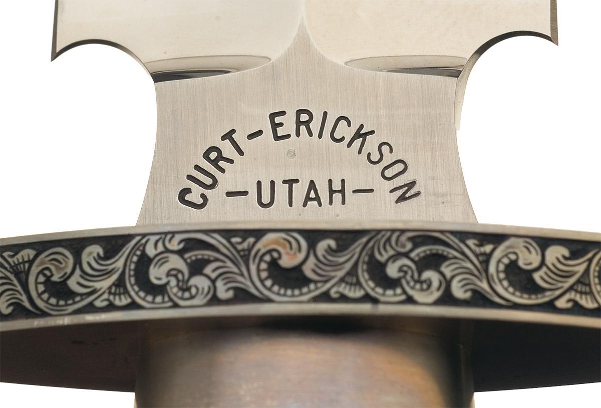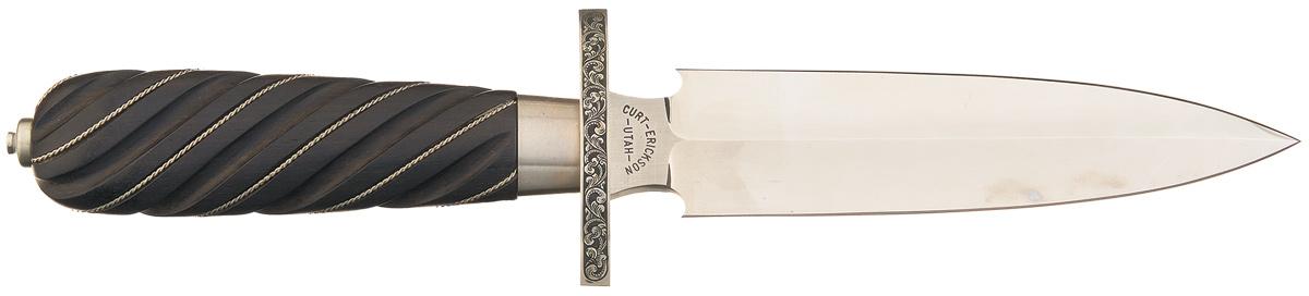This dagger was fabricated by Curt Erickson who began crafting handmade knives in 1983 under the tutelage of legendary knifemaker Buster Warenski. Erickson become one of the youngest voting members of the Knifemakers' Guild and today creates renowned art knives with his wife Julie. This Erickson dagger has a 5 3/4 inch blade marked "CURT-ERICKSON / -UTAH-". The diamond shaped guard is scroll engraved. The nicely figured hardwood fluted handle is adorned with twisted silver wire. OAL: 10 3/4" This dagger was made before Erickson married Julie.